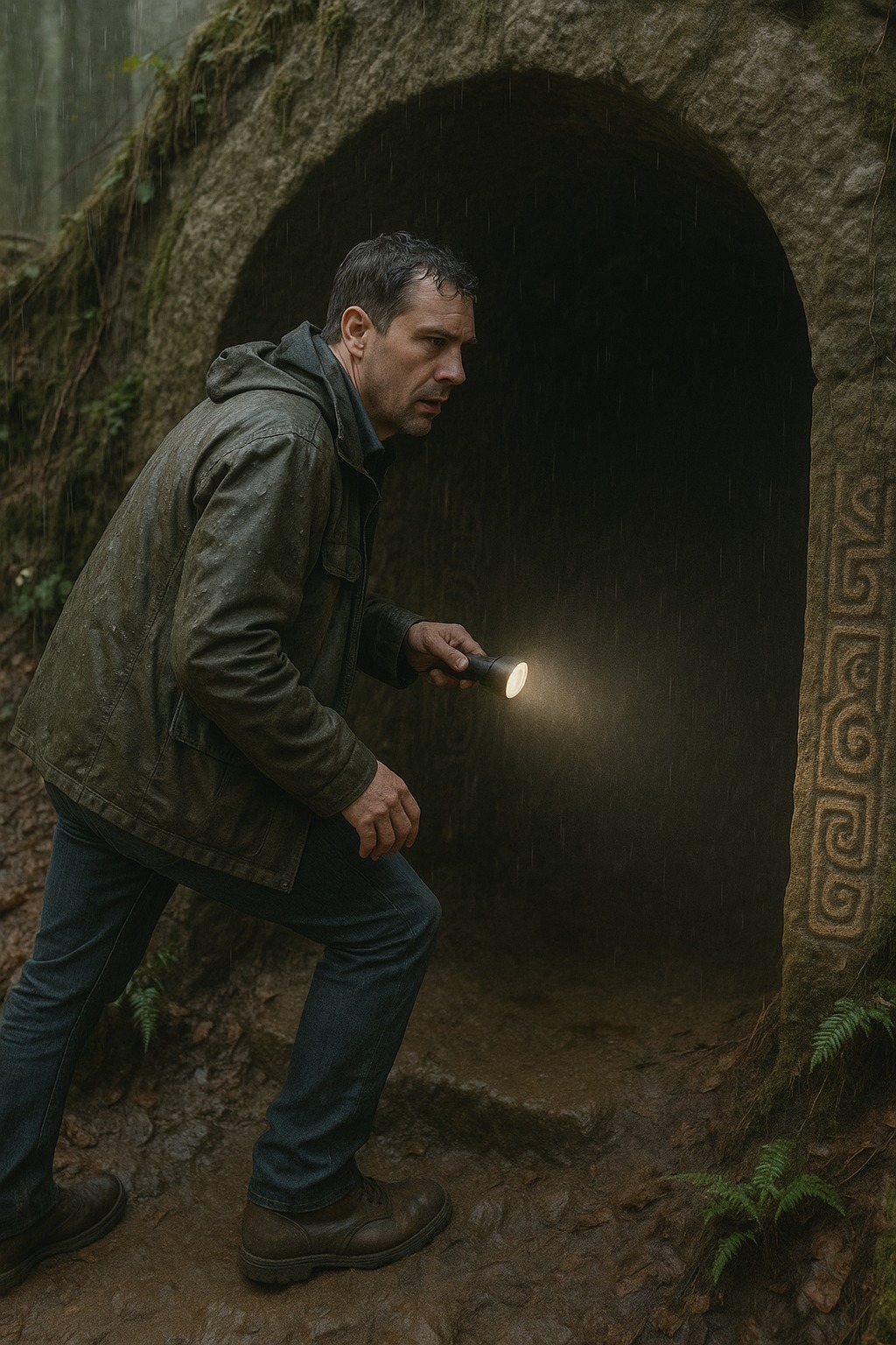Ilma oli heti kylmempi, täynnä märän kiven ja maan tuoksua. Portaat johtivat kapeaan käytävään, jonka seinät olivat kosteat ja ahtaat. Valo heijastui outoihin merkkeihin – spiraaleihin, risteihin ja muihin symboleihin, jotka kimaltelivat heikosti kuin ne olisi veistetty tarkoituksella.