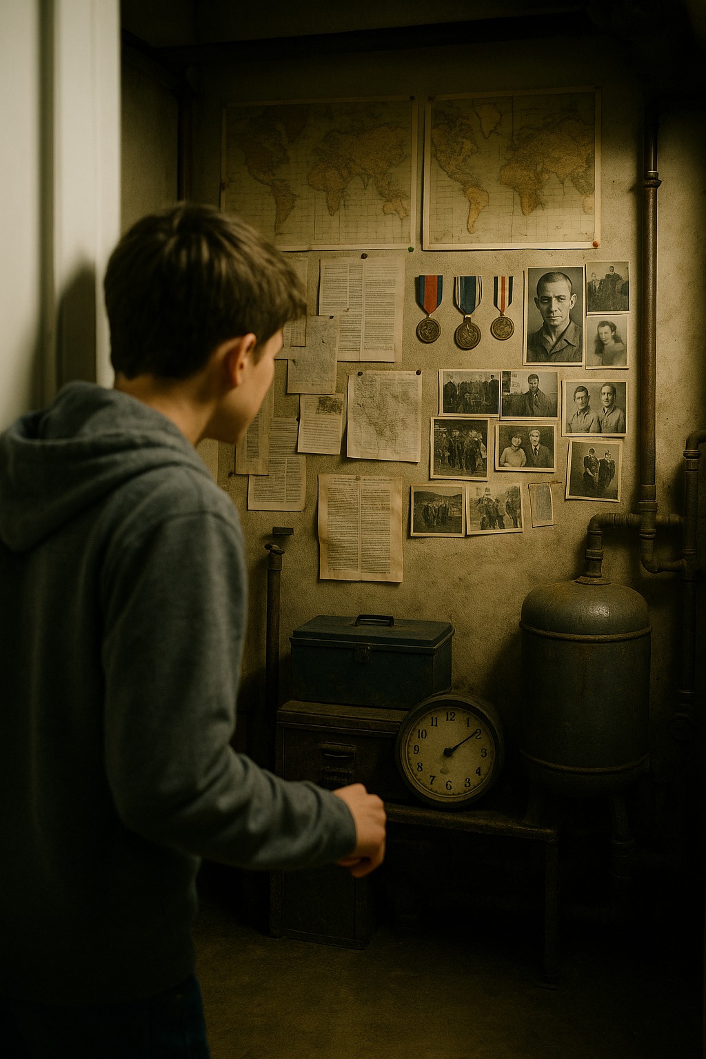 Kattilahuoneessa ei ollut vain putkia ja venttiilejä. Seinät olivat täynnä karttoja, lehtileikkeitä ja mustavalkoisia valokuvia. Haalistuneet mitalit roikkuivat siisteissä riveissä. Suuri arkku oli auki, täynnä kansioita ja mappeja.