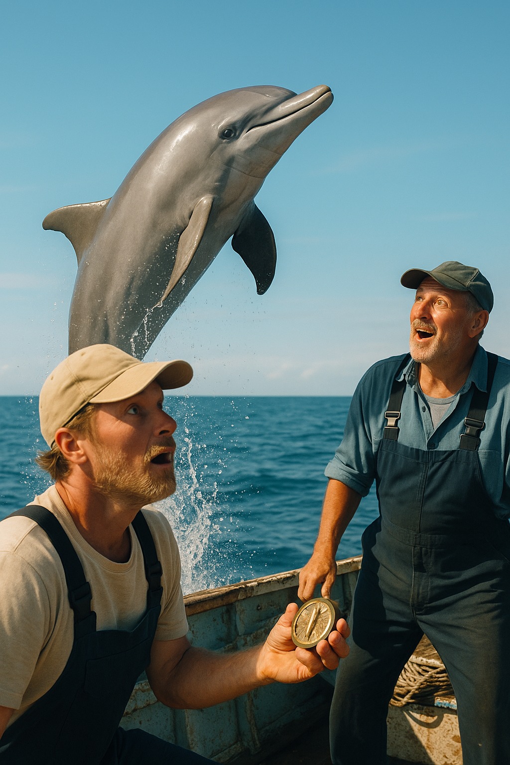Viikon kuluttua lähdimme taas merelle. Jossain vaiheessa delfiinit ilmestyivät veneen viereen. Niitä oli kolme. Niiden joukossa oli myös meidän pikkuinen. Se ui lähimmäksi, hyppäsi ilmaan ja roiskutti vettä päällemme päästä jalkoihin. Kun se taas nousi pintaan, sen hampaissa oli vanha köysi – pala verkkoa. Se heitti sen suoraan veneen laidalle.