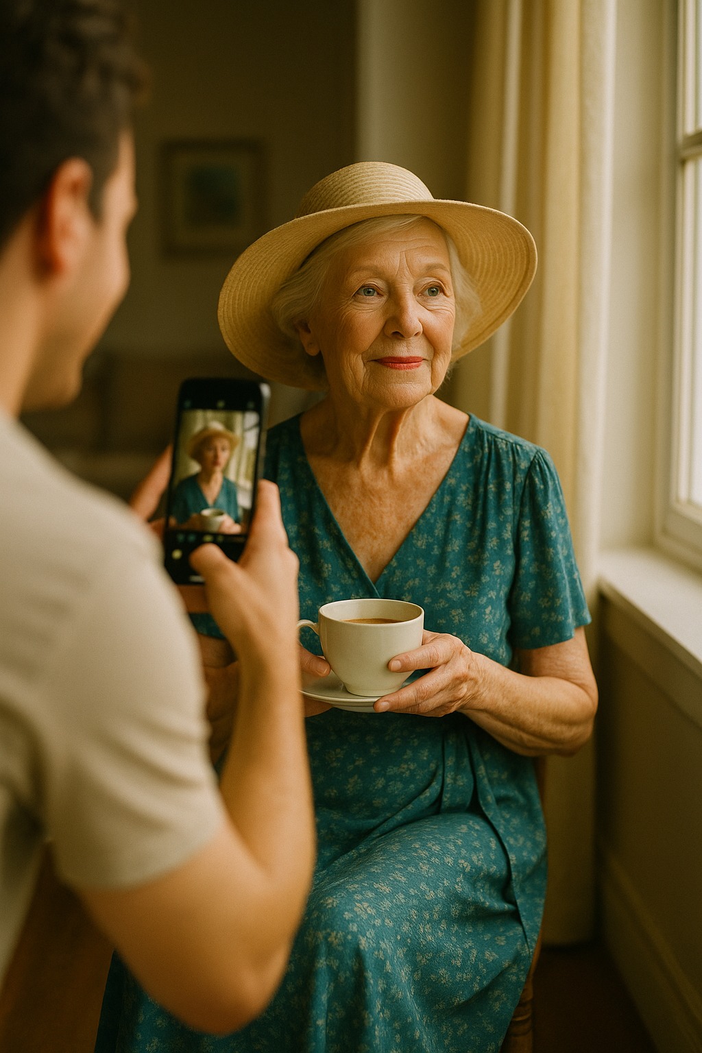 Aamu tuoksui kahvilta ja pelargonialta. Greta seisoi parvekkeella, kasteli kukkia ja mutisi itsekseen — kuin juttelisi lehdille. Aurinko valoi olkapäille kullanhohtoista valoa, ja lapsenlapsi, joka oli tullut piipahtamaan, pysähtyi ovelle.