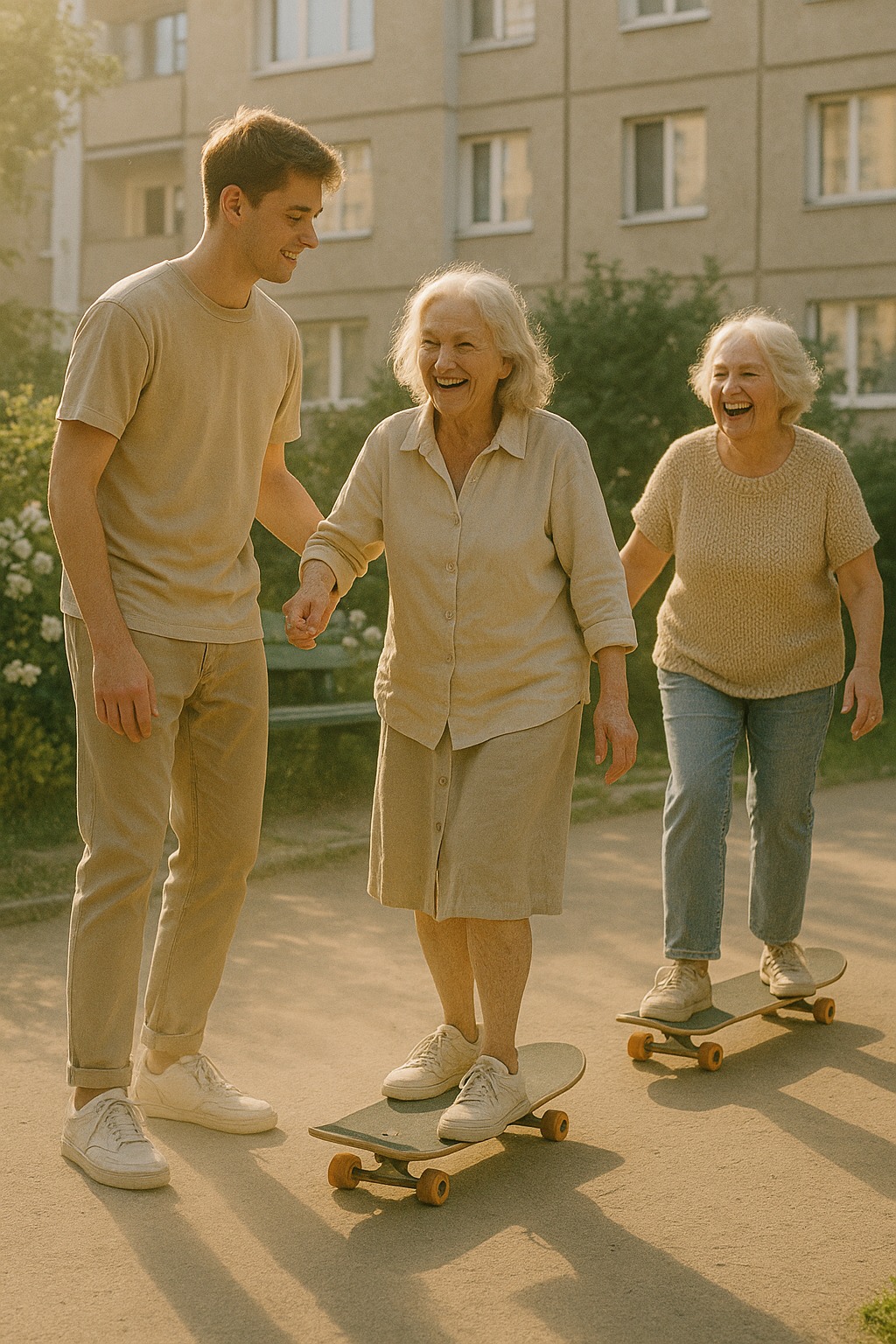 Piha, jossa Lucas skeittasi ystäviensä kanssa, oli meluisa vain iltaisin. Päivällä — tyhjyys: vanhat penkit, kyyhkyt, mummot, jotka puhuivat säästä ja elämästä. Hän otti vauhtia, liukui, hyppäsi — ja tunsi olevansa elossa.