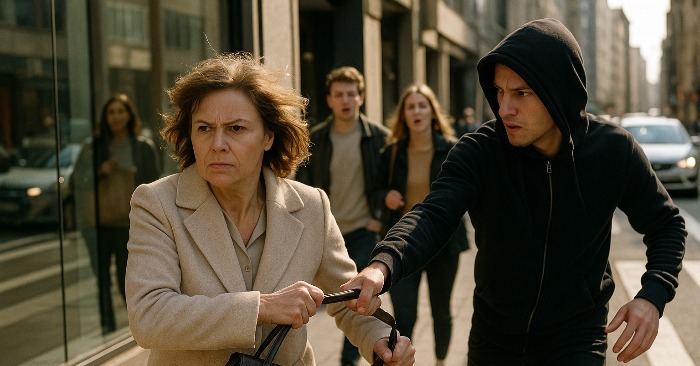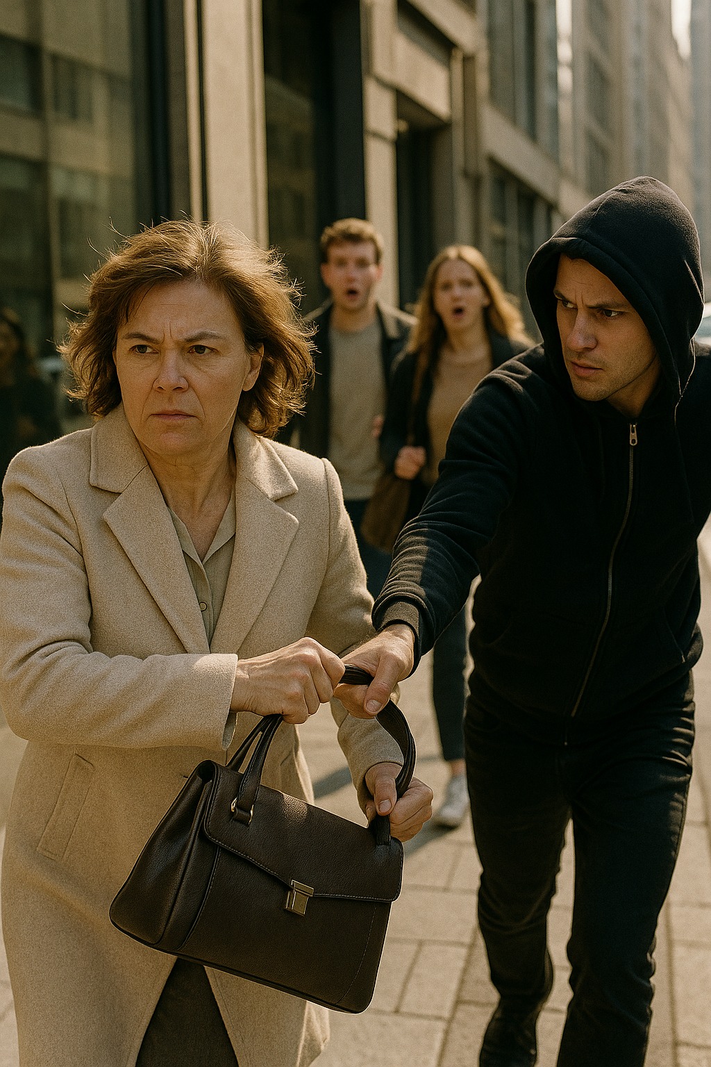 Hihna repäistiin hänen kädestään, laukku lensi, keho vastasi kivulla. Nuori huppupäinen mies juoksi jo eteenpäin, liukuen asfaltilla kuin jäällä.