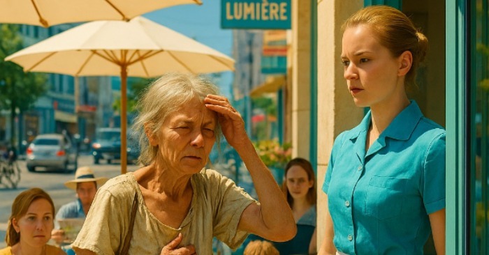 Nainen pysähtyi pienen kahvilan lähelle kadunkulmassa.