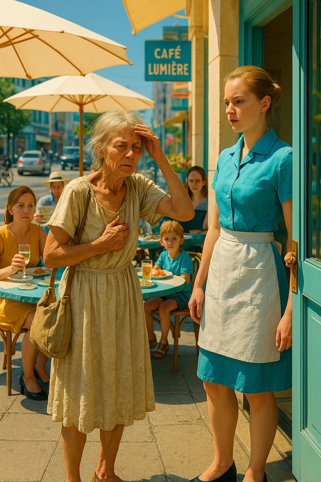 Anna käveli terassille ja sanoi hiljaa ovella olevalle tytölle: ”Anteeksi… saisinko lasillisen vettä?”