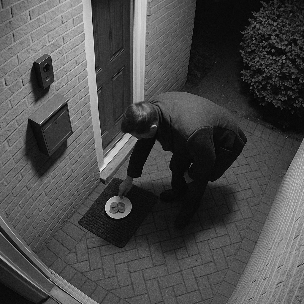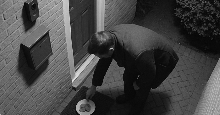 Niinpä he päättivät asentaa liiketunnistimella varustetun kameran. Sinä yönä kamera laukesi ja näytti pitkässä takissa ja hupussa olevan miehen, joka lähestyi hitaasti heidän ovelleen. Hän laski pussin varovasti alas, katsoi ympärilleen ja katosi pimeyteen.