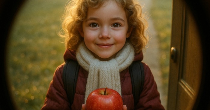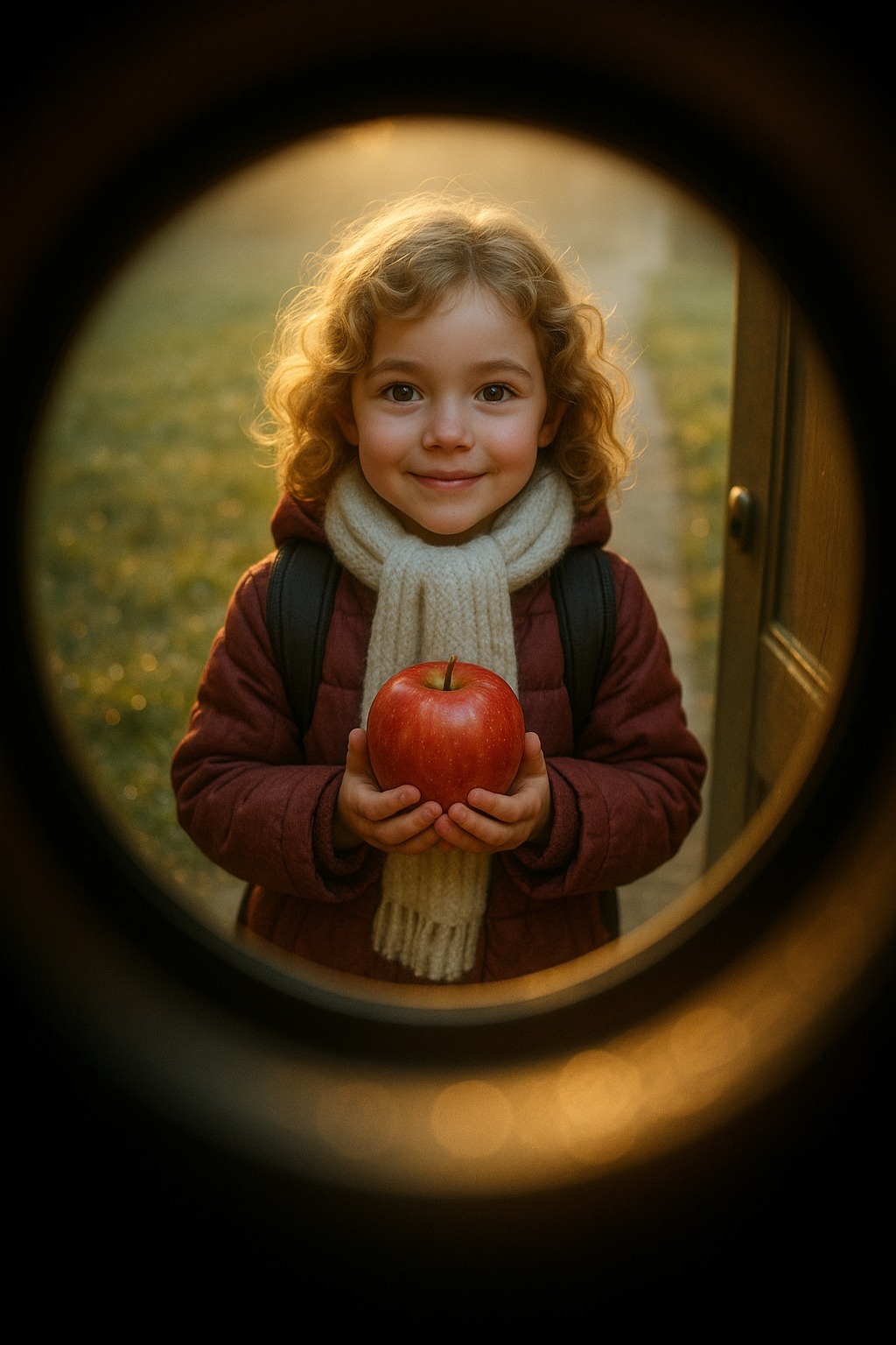 Pieni tyttö, noin seitsemänvuotias, pukeutunut viininpunaiseen takkiin ja kantanut valkoista reppua. Hän saapui portille, kyykistyi, laski omenan maahan ja – ikään kuin jonkun katseen aistien – katsoi taloani.