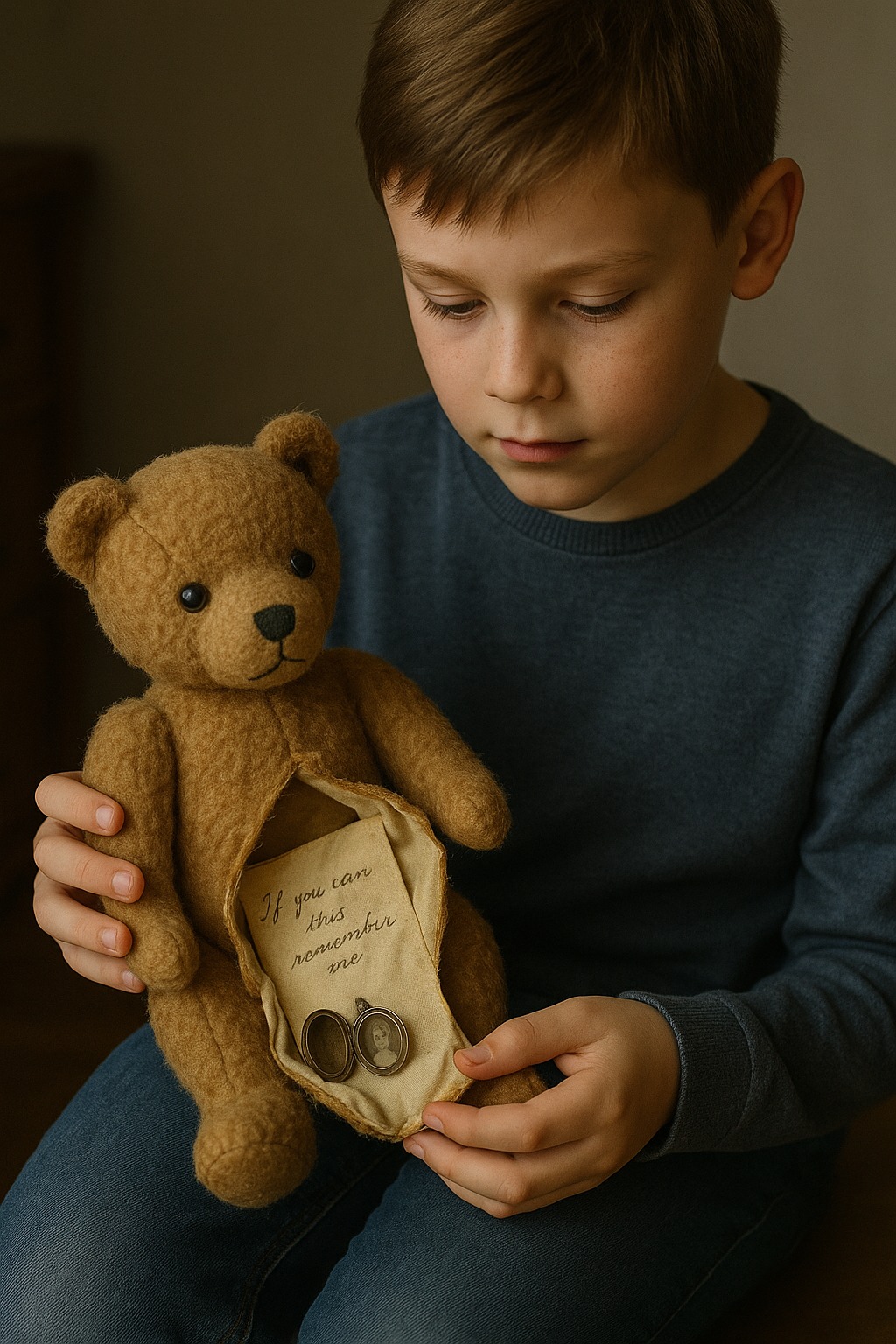 Uteliaisuus voitti hänet. Seuraavana päivänä poika otti esiin pienet sakset ja leikkasi varovasti nallekarhun selän sauman auki. Tavallisen täytteen sijaan hän tunsi sen sisällä paksun, vanhaan kankaaseen käärityn nipun. Kun hän avasi kääreen, sieltä putosi pieni hopeinen medaljonki ja kellastunut paperinpala.