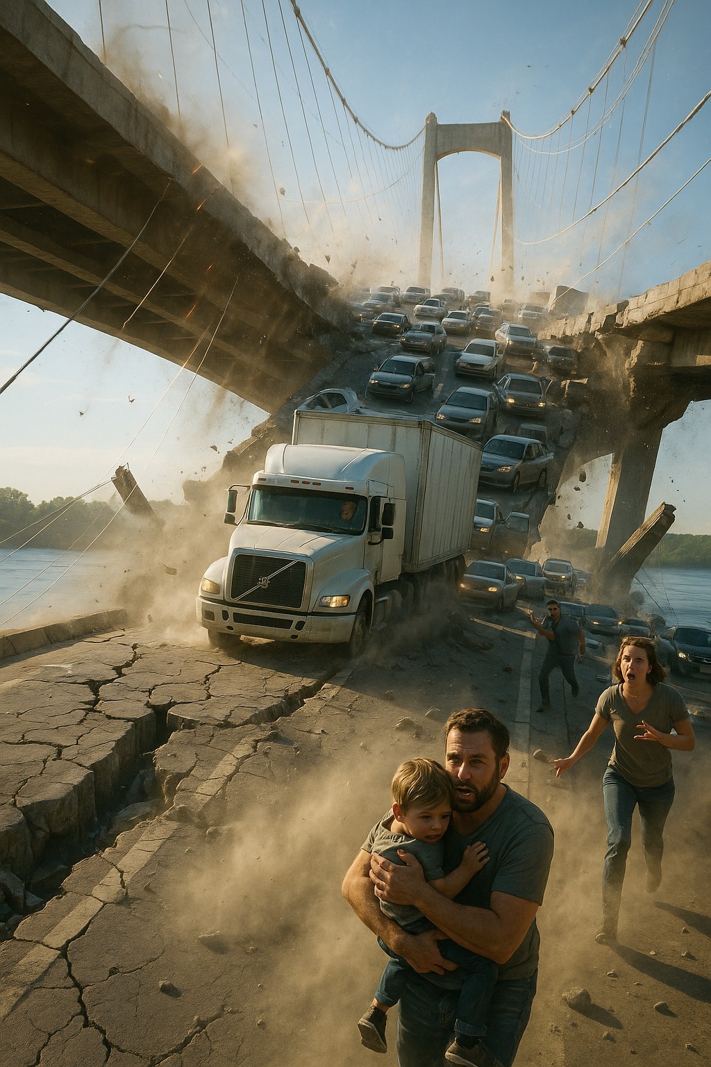 Ensin vasen reuna antoi periksi – osa sillan jännevälistä, jota pitkin autot olivat kulkeneet sekunti sitten, romahti jokeen.