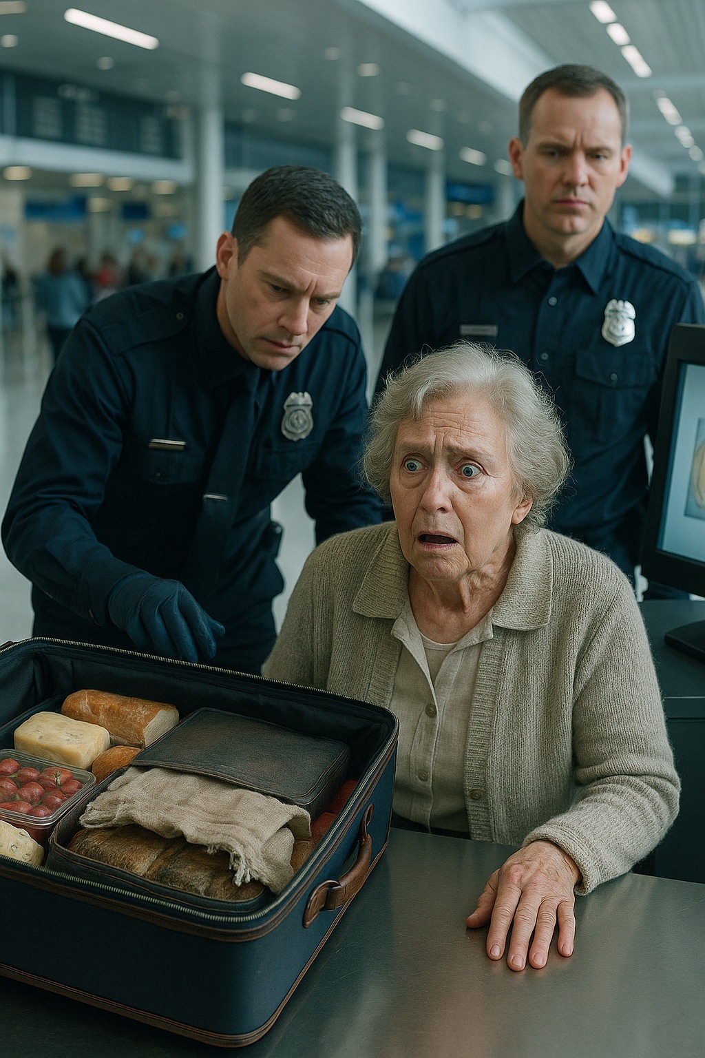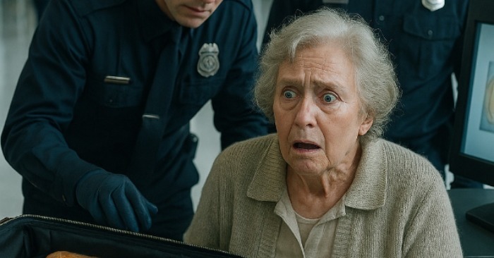 Turvatarkastuksen jono eteni hitaasti. Ihmiset haukottelivat, asettivat matkalaukkuja hihnalle, tarkistivat passeja. Kaikki oli rauhallista, kunnes iäkäs nainen astui portille — pieni, harmaassa takissa, huivi siististi sidottuna leuan alle. Kasvot väsyneet, mutta silmissä lempeyttä.