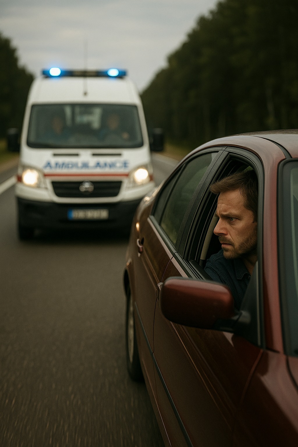Ambulanssin kuljettaja jarrutti voimakkaasti, auto heilahti — hetken näytti, että se kaatuu. Mutta se pysyi tiellä. Aleksei vain hymyili ja painoi kaasua.