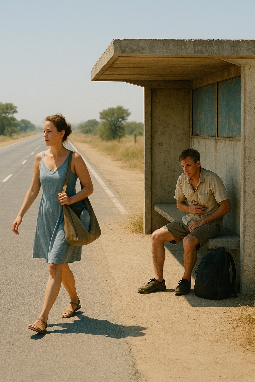 Mies nyökkäsi, loukkaantumatta. Laski vain päänsä ja sulki silmänsä, kuin voimat olisivat loppuneet. Lisa jatkoi matkaa, katsoen tietä. Aurinko häikäisi, hiki valui kaulalle. Hetken kuluttua hän kääntyi — mies istui yhä, liikkumatta.