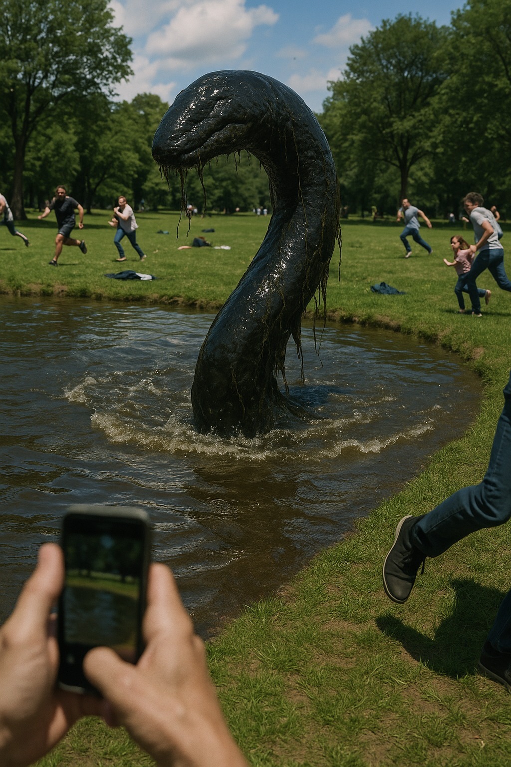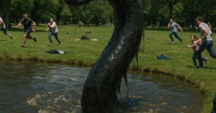 Päivä alkoi kuten tavallisesti. Aurinkoinen puisto, lasten naurua, sorsia veden äärellä. Perheet istuivat nurmikolla, jotkut puhaltelivat saippuakuplia, toiset ottivat kuvia suihkulähteellä. Kaikki oli rauhallista — kunnes lammen keskellä vesi alkoi väreillä.