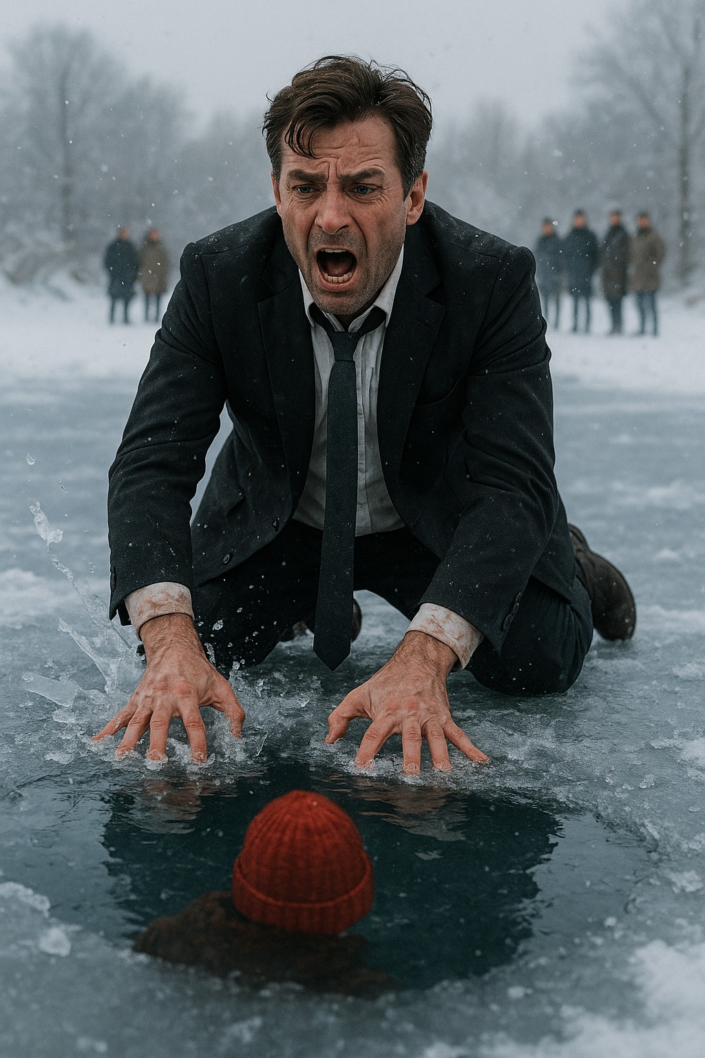 Mies harmaassa puvussa, kravatti vinossa. Hän juoksi jäälle ajattelematta.