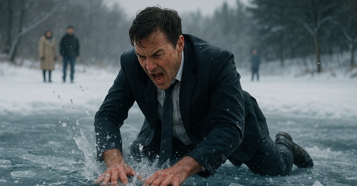 Mies harmaassa puvussa, kravatti vinossa. Hän juoksi jäälle ajattelematta.