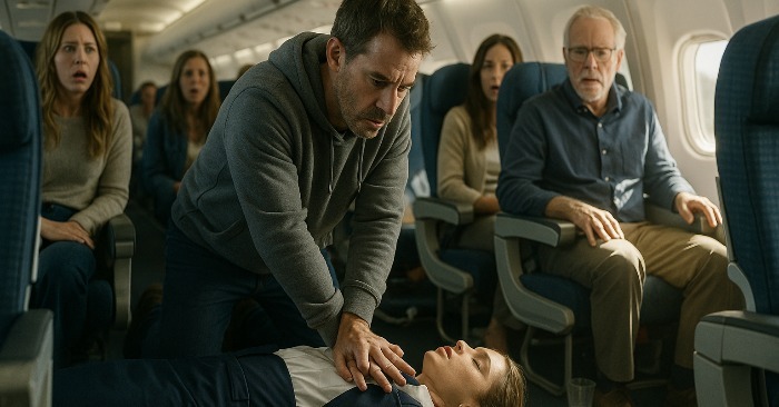 Lentoemäntä, joka hetki sitten jakoi juomia, romahti äänettömästi istuinrivien väliin. Metallitarjotin kolahti lattiaan, vesi levisi matolle.