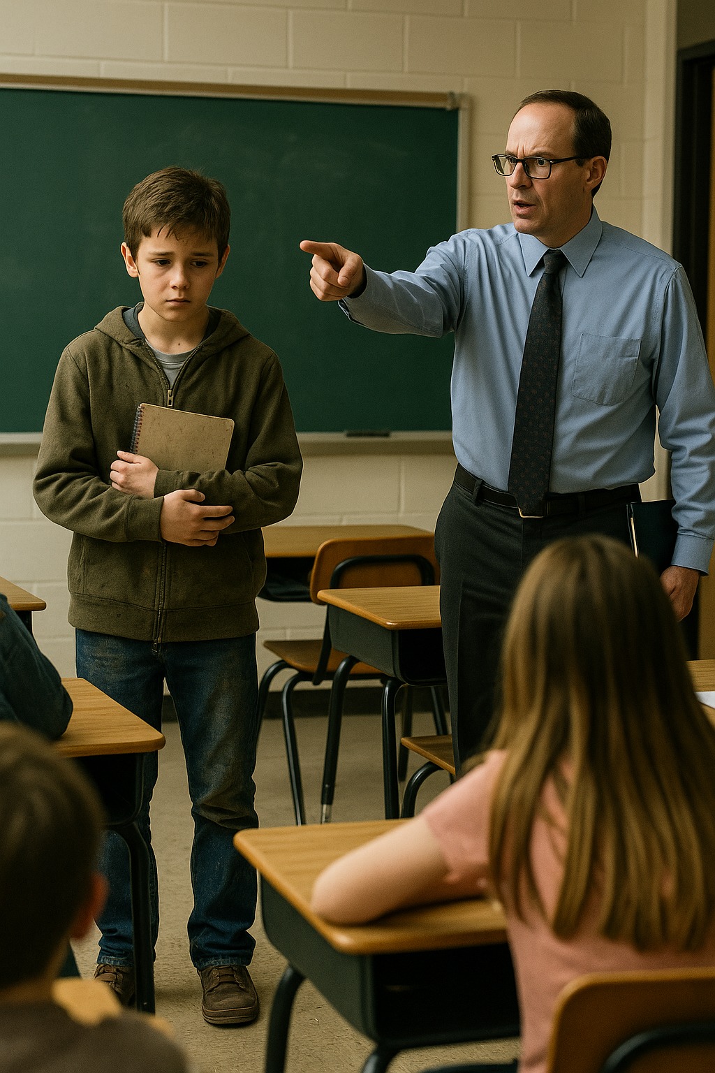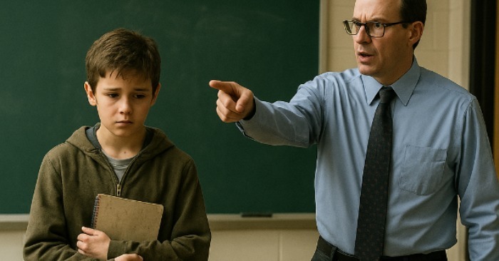 — Ethan, sanoi opettaja tiukasti, miksi olet tullut kouluun tuossa kunnossa? Tämä ei ole korjaamo — tämä on koulu.