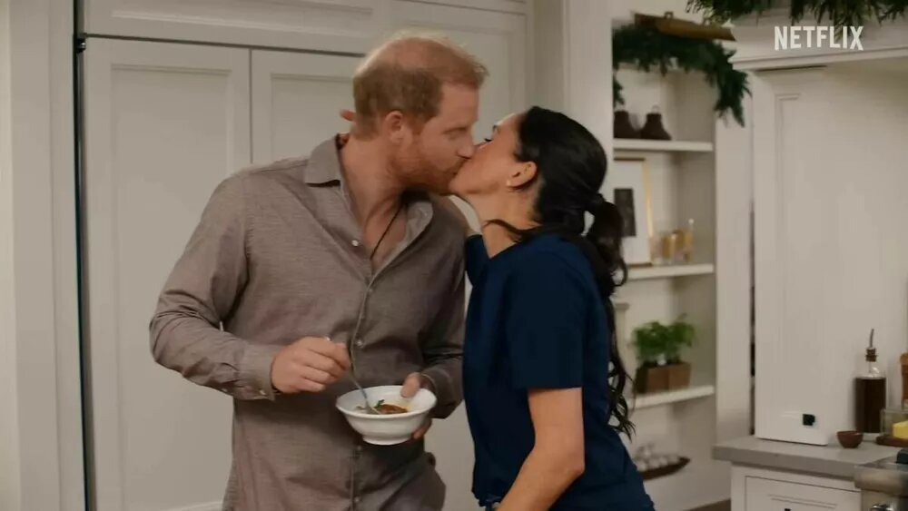Alkuhetkillä Harry antaa Meghanille hellän suudelman samalla kun tämä kattaa juhlapöytää. Markle kaataa värikästä juomaa ja valmistaa todennäköisesti perheen suosikkiruokaa. Meghanilla oli tummansininen t-paita ja Harrylla ruskea paita, mikä loi lämpimän, kodikkaan joulunodotuksen tunnelman.