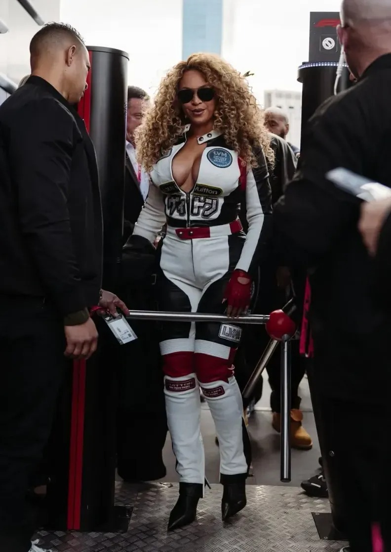 Tapahtumaan Beyoncé valitsi rohkean ja näyttävän Louis Vuitton -asun: valkoisen nahkakokonaisuuden, joka oli saanut inspiraationsa kilpa-ajajien varusteista ja muokattu trendikkääksi lyhyeksi yläosaksi ja siroiksi housuiksi. Kokonaisuuden täydensivät punaiset sormettomat hansikkaat, korkokengät ja tummat aurinkolasit.
