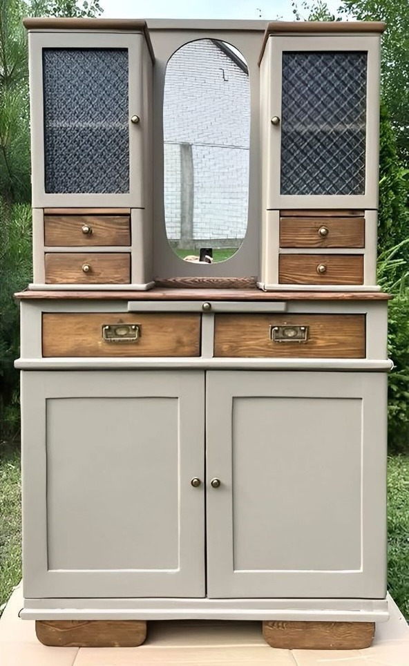 Täytin halkeamat, syvennykset ja lohkeamat erityisellä puukitillä. Kuivumisen jälkeen — kevyt viimeistelyhionta. Päätin olla maalaamatta joitakin osia (hyllyjä, laatikoiden osia), ja korostin niitä petsillä säilyttääkseni luonnollisen rakenteen.