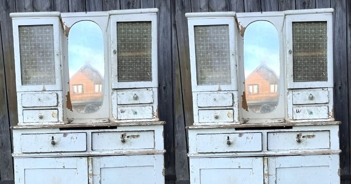 Kun näin tämän vanhan, ajan runteleman liukuovikaapin ensimmäistä kertaa, käteni valahtivat alas. Lo hkeillutta maalia, haljenneita ovia, rikki mennyt metalliosa, naarmuja ja kolhuja — kaikki kertoi, että tämä huonekalu oli jo kauan sitten poistettu käytöstä. Mutta sisälläni heräsi halu yrittää palauttaa sille arvokkuus ja uusi elämä. Kuvasta näkee hyvin, millainen „veteraani“ kaappi oli ennen entisöintiä — ja kuinka elegantiksi se muuttui uudistuksen jälkeen.