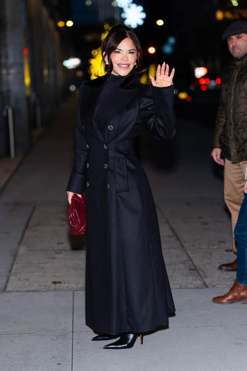 Hänen asunsa pääosassa oli pitkä musta kaksirivinen takki, jossa oli jämäkät olkapäät ja kontrastiset, valkoisilla yksityiskohdilla koristellut napit. Kankaan kevyt kiilto toi asuun lisää eleganssia. Tak in alla Lauren käytti läpinäkyvää korkeakauluksista yläosaa ja pehmeää neulottua hametta — yhdistelmää, jossa nykytyyli kohtaa klassisen.