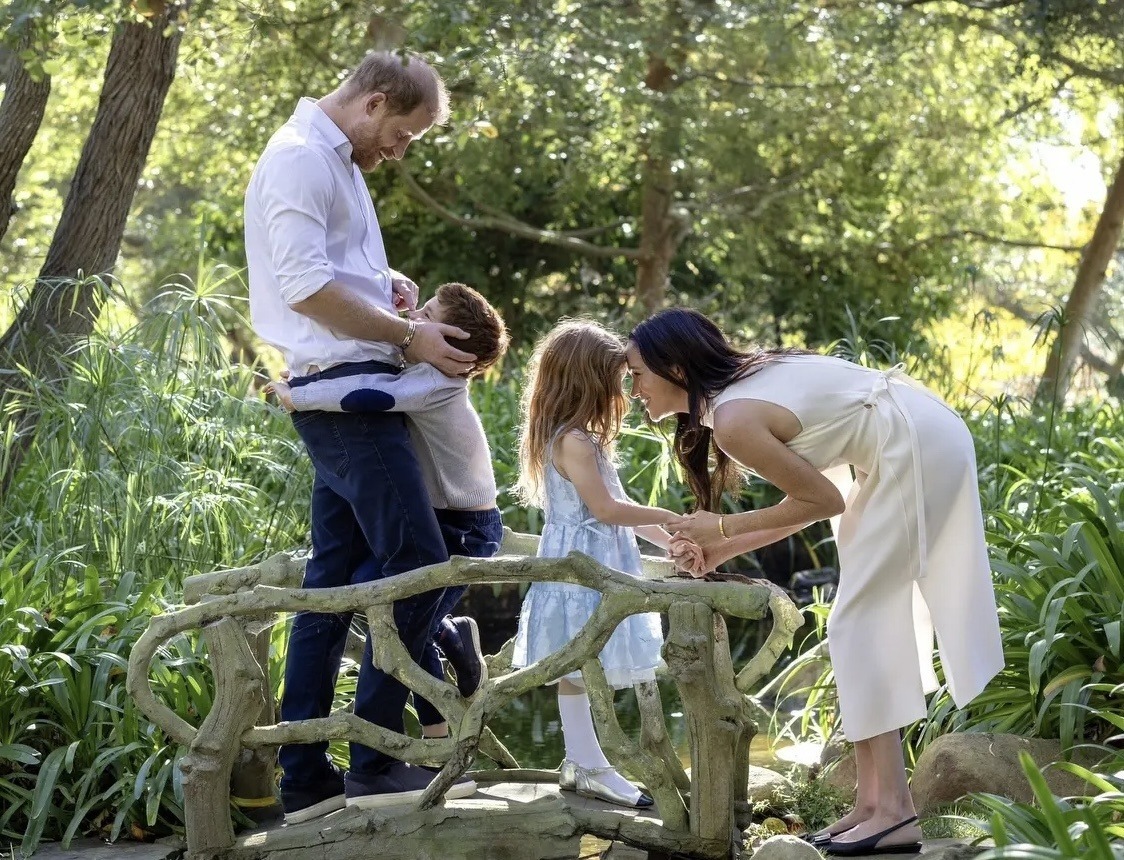 Kuvissa nähdään koko perhe, mikä itsessään on harvinaista heidän julkisissa esiintymisissään. Puoliso ja lapset on kuvattu puisella sillalla ulkona, oletettavasti heidän kotinsa lähellä Montecitossa, ja kokonaisuus rakentuu pehmeiden valkoisten ja sinisten sävyjen varaan. Meghan esiintyy yksinkertaisessa valkoisessa hihattomassa mekossa ja mustissa teräväkärkisissä kengissä. Harry ja Archie ovat pukeutuneet farkkuihin, ja Lilibet täydentää kokonaisuuden vaaleansinisellä kerroksellisella mekolla, valkoisilla polvisukilla ja hopeisilla kengillä, mikä vahvistaa rauhallisuuden ja perheharmonian tunnetta.