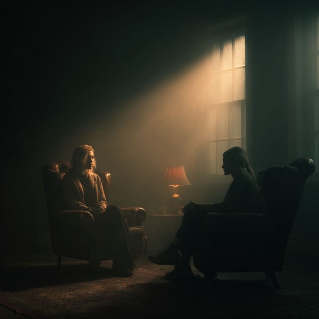 Alyssa palasi farkuissa ja neuleessa, hiukset auki. Ilman hoitajan asua hän näytti nuoremmalta. Hauraammalta. Hän istui minua vastapäätä nojatuolin reunalle, kädet niin tiukasti ristissä, että rystyset valkenivat.