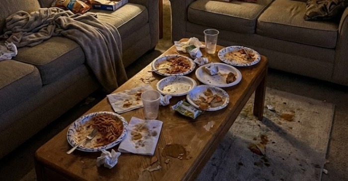Olohuone näytti siltä kuin siellä olisi pidetty villit opiskelijabileet. Pikaruokapakkauksia lojui kaikkialla, rasvaisia laatikoita puoliksi syötyine hampurilaisineen, tölkkejä lattialla. Sipsit oli tallottu mattoon, murskattu pölyisiksi murusiksi.