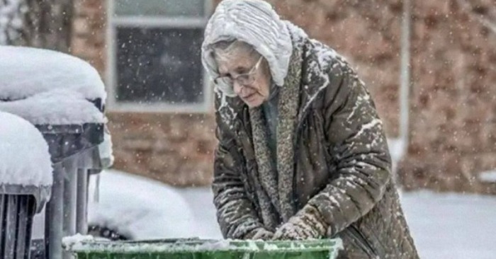 Sitten näin vanhemman naisen, joka kyykkäsi rakennuksen takana roskiksen luona.