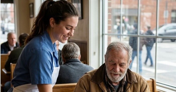 Ja silti hänen sydämensä ei ollut kova. Hän hymyili tuntemattomille, täytti kahvikupit ennen pyytämistä — eikä koskaan ohittanut vanhusta, joka istui yksin ikkunan vieressä.