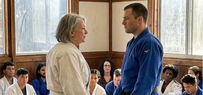 Hopeahiuksinen nainen, jonka hiukset oli siististi koottu nutturalle, astui salin kynnyksen yli yllään moitteettoman silitetty kimono. — Tämä paikka ei ole sinulle, mummo! — valmentaja Jackson heitti pilkallisesti,