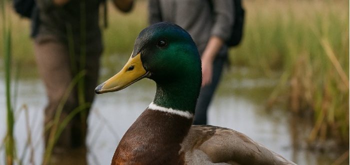Kävellessään luonnonsuojelualueella lähellä jokisuistoa turistit huomasivat jotakin, mikä aluksi vaikutti vitsiltä. Vastarannalla, ruovikossa, seisoi sorsa… nelijalkainen. Aluksi kukaan ei uskonut silmiään. ”Se on luultavasti vain yksi sorsa takanani”,