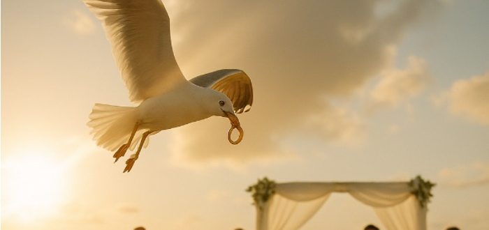 Aurinko paistoi korkealta ja kylpi rantaa pehmeässä kultaisessa valossa. Ilma tuoksui suolalta ja samppanjalta, ja valkoiset nauhat liehuivat laiskasti kaaren reunoilla. Aallot vyöryivät kohti rantaa, iskeytyen märkään hiekkaan,