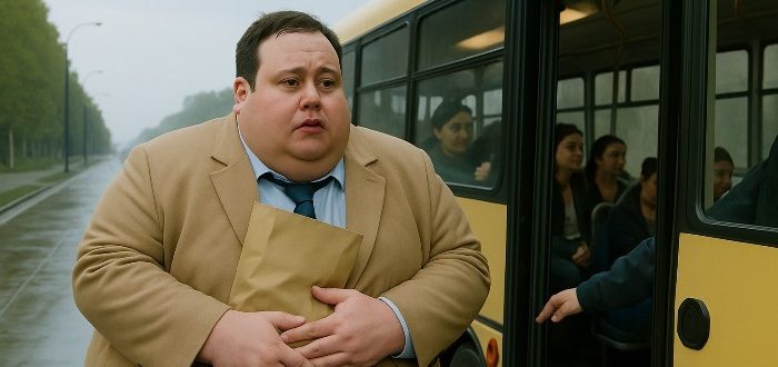 Aamu oli tavallinen: harmaa taivas, kahvin tuoksu kioskilta, lammikot sateen jälkeen.Martin seisoi pysäkillä, laukku toisessa kädessä ja paperipussi eväineen toisessa.Paita kiristi, kaulus puristi, kainalot olivat märät — kaikki
