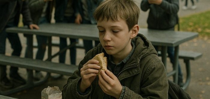 Koulun ruokasalissa oli aina meteliä — naurua, tarjottimia, lusikoiden kilinää. Mutta kaiken melun keskeltä kuului usein sama nauru — suunnattuna poikaan, joka istui yksin ikkunan ääressä. Hänen nimensä