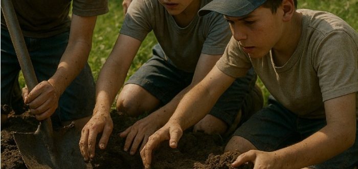 Sinä päivänä oli lämmintä ja hiljaista. Naapurit istuivat penkeillä auringossa, joku leikkasi nurmikkoa, ja vanha herra Hansen seisoi aidan vieressä katsellen maata mietteliäänä. Kun pihan pojat — Erik,
